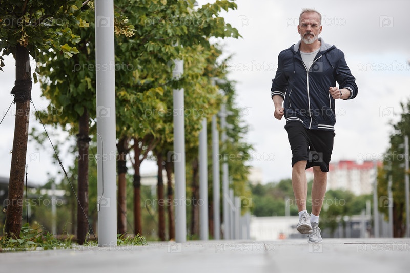 Пожилой мужчина бегает по тротуару в парке Morning City