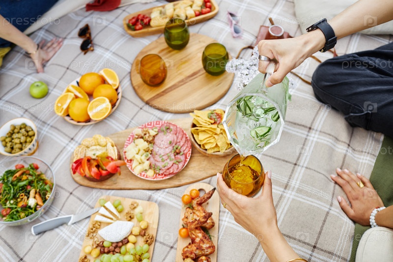 Наслаждайтесь пикником с разнообразными свежими ингредиентами и напитками