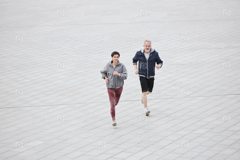 Пожилая пара бежит через черепичную серую площадь в городском парке