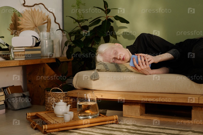 Молодая женщина с белыми волосами отдыхает в гостиной