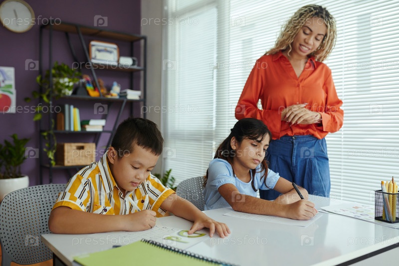 Дети пишут в классе с заботливым учителем, наблюдающим
