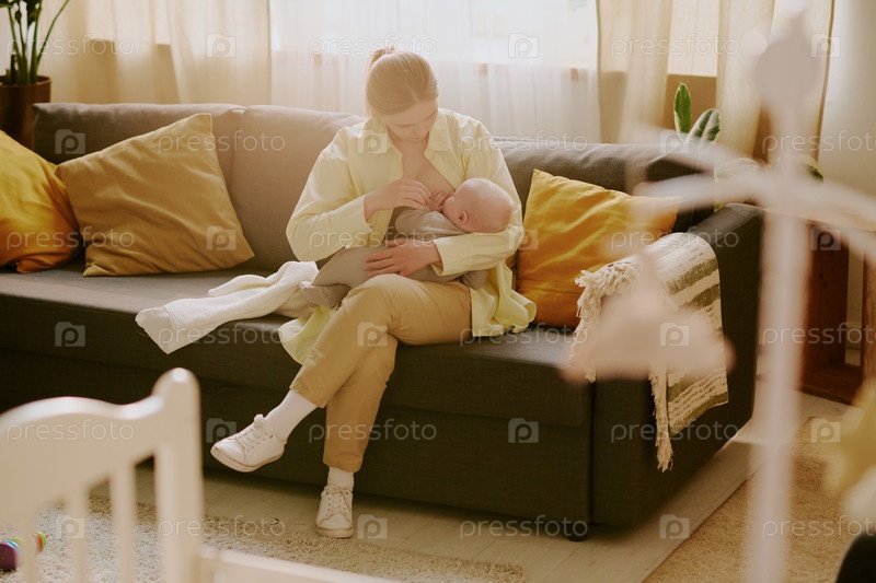 Заботливая мать, кормящая младенца в уютной обстановке гостиной