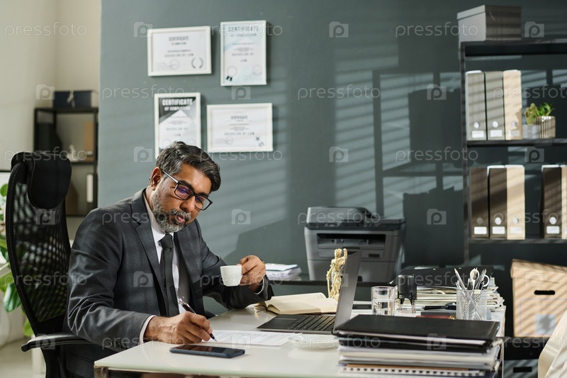 Адвокат с чашечкой кофе подписывает бумагу