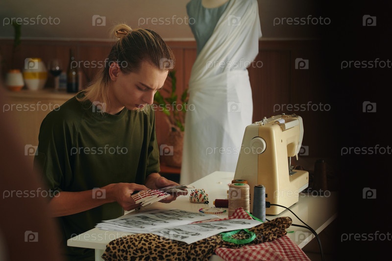 Дизайнер, выбирающий нитки для платья