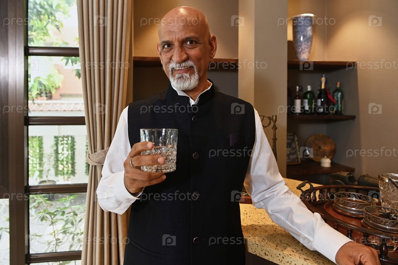 Зрелый индийский мужчина пьет алкоголь