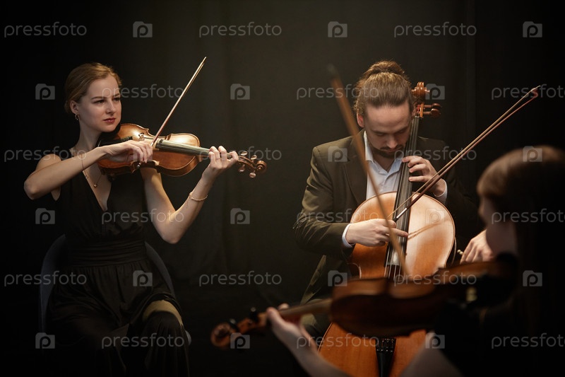 Камерный ансамбль в элегантной одежде выступает в студии