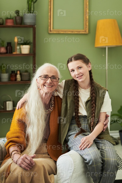 Пожилая женщина сидит с внучкой, улыбаясь счастливо