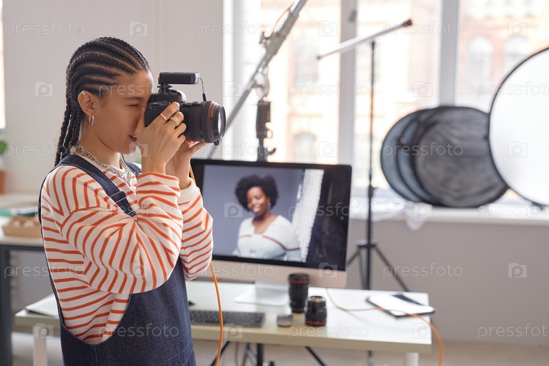 Женщина-фотограф снимает фотографии в студии