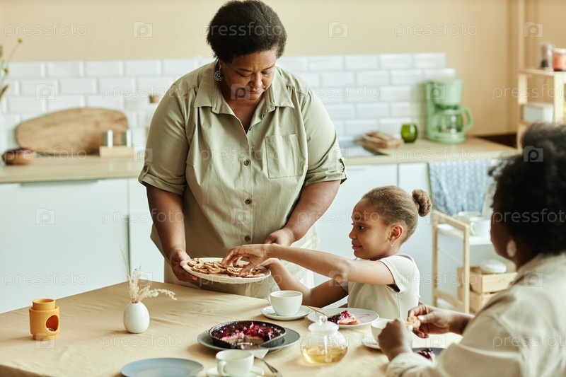 Бабушка вручает печенье девочке, в то время как семья ест пирог за кухонным столом