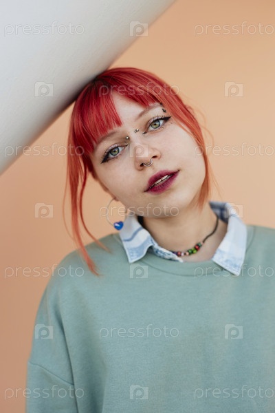 Портрет девушки с розовыми волосами и пирсингом носа, позирующей на свежем воздухе