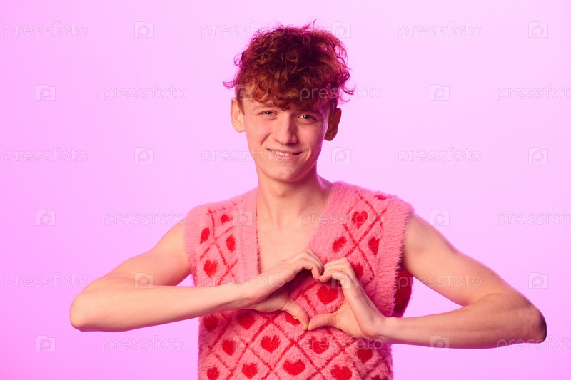 Портрет улыбающегося молодого человека, жестикулирующего формой сердца
