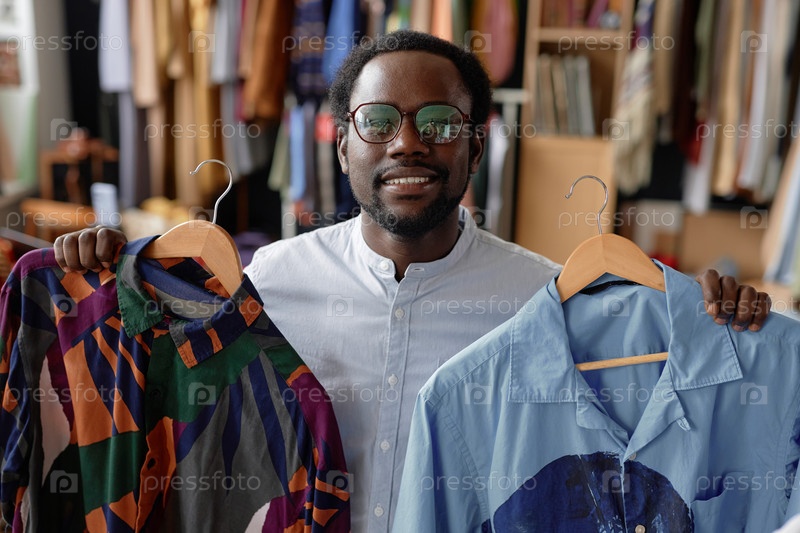 Портрет улыбающегося чернокожего мужчины, держащего вешалки с рубашками в магазине