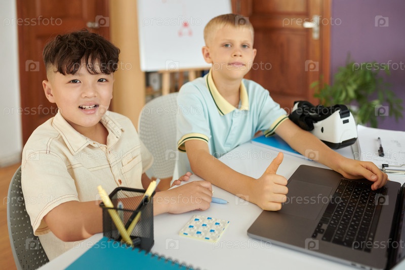Улыбающиеся мальчики работают вместе над цифровым проектом