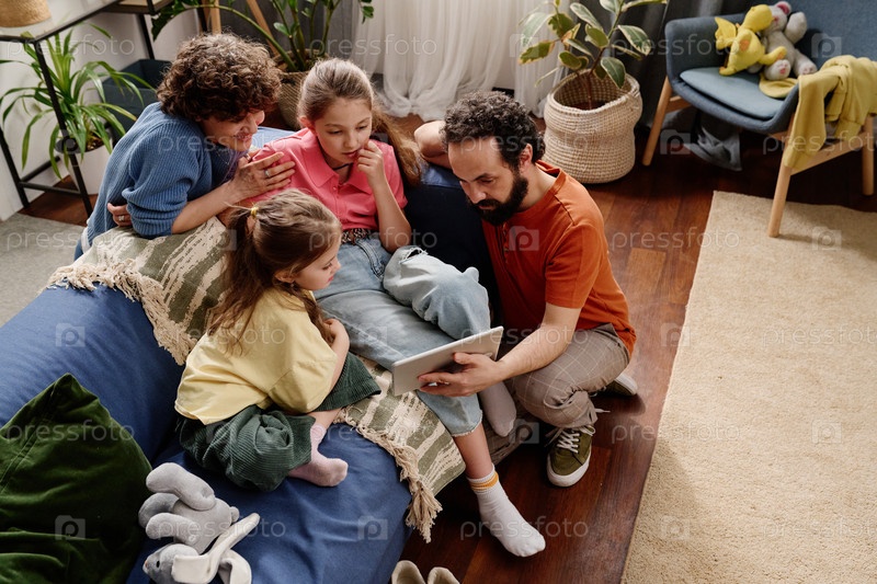 Семья наслаждается времяпрепровождением с планшетом вместе на уютном диване