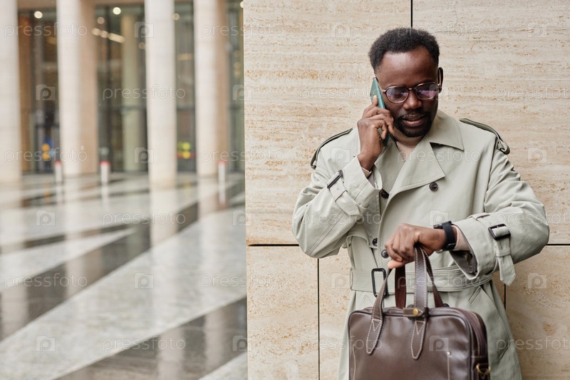 Разговаривать по телефону, держа кожаный портфель