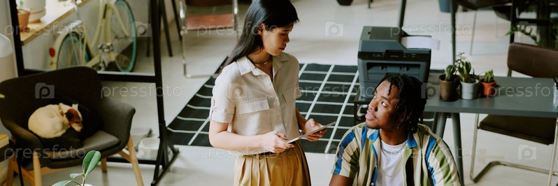 Мужчина и женщина, совместно работающие в офисе Бэннер сайта мужчины