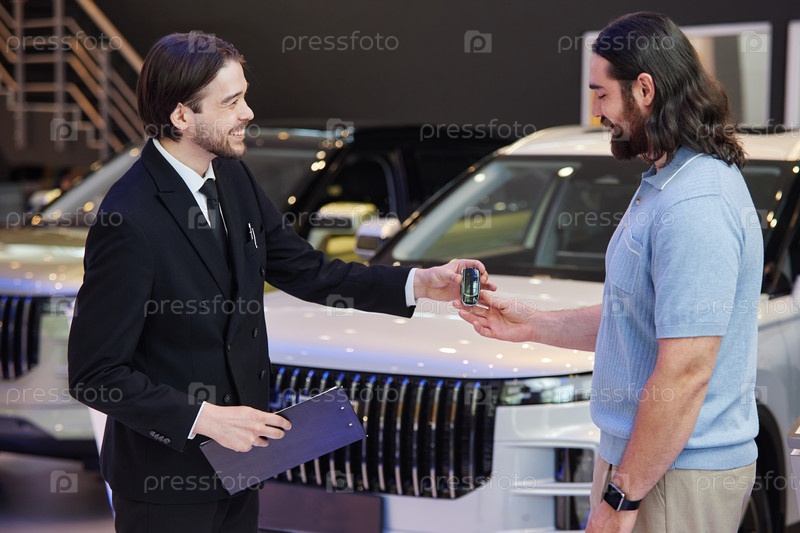 Улыбающийся автодилер вручает ключ человеку, покупающему автомобиль в центре автомобильных дилеров