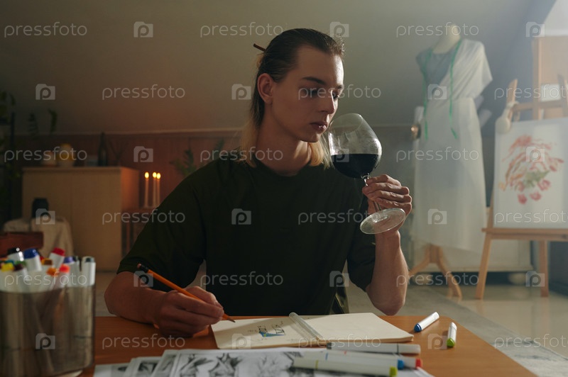 Дизайнер рисует эскизы у бокала вина