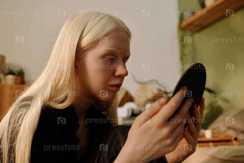 Девушка с альбинизмом смотрит в зеркало