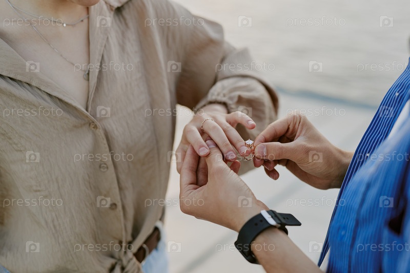 Держась за руки обменивая свадебные кольца на открытом воздухе