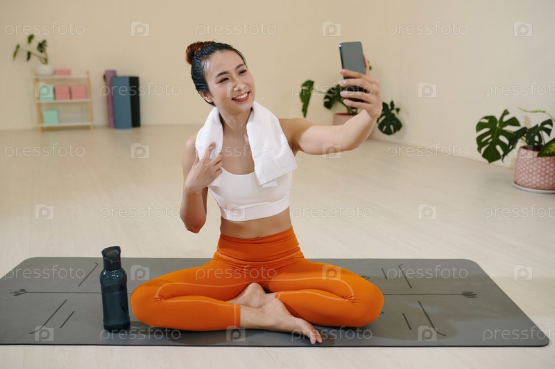 Молодая женщина делает селфи во время сеанса йоги без коврика