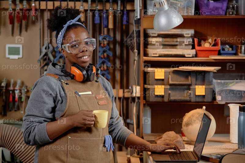 Улыбающаяся женщина, одетая в защитное снаряжение на мастерской