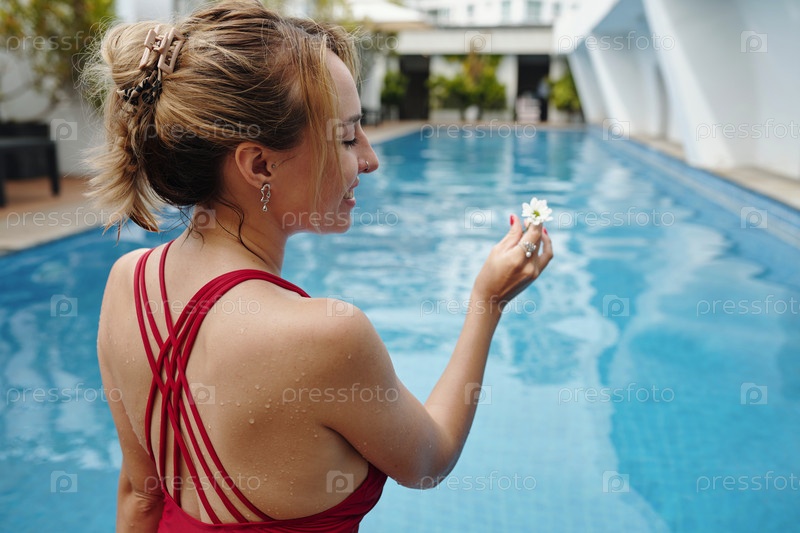 Наслаждаясь сценой у бассейна, держа цветок в руке