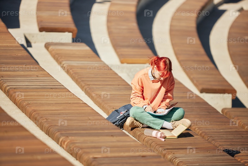 Женщина-студент пишет в блокноте на амфитеатральной скамейке Learning Outdoors