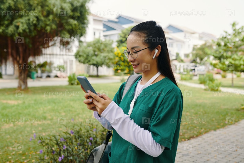 Улыбающаяся азиатская женщина использует смартфон на открытом воздухе