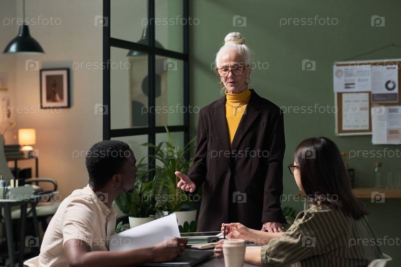 Старшая женщина, ведущая бизнес-встречу в современном офисе