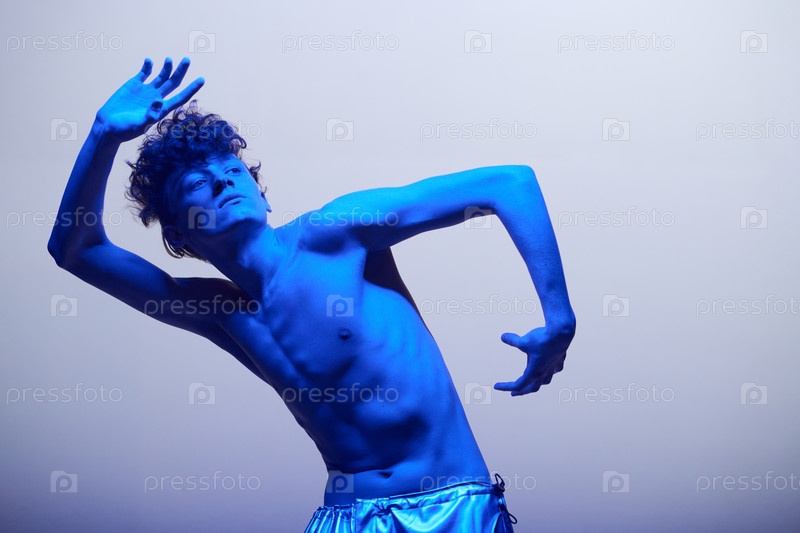 Танцующий мужчина позирует под художественным голубым светом