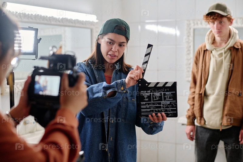 Кинорежиссер держит доску с наблюдающим членом экипажа