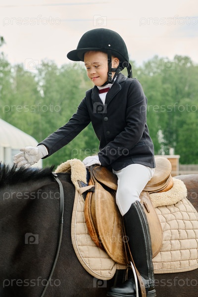 Улыбающийся мальчик едет на лошади в открытой конной обстановке