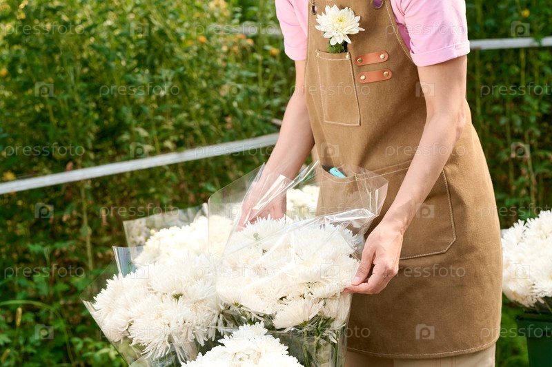 Женщина, устраивающая букет белых цветов на рыночной продаже