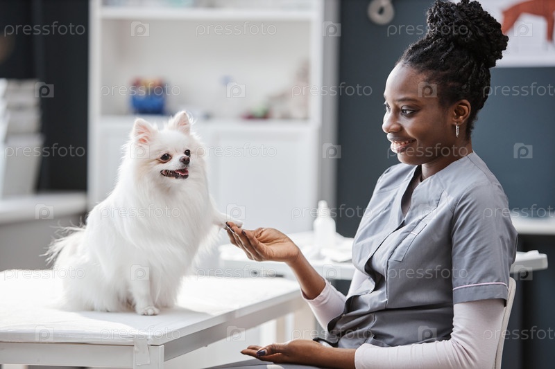 Белый щенок кладет лапу на руку ветеринара