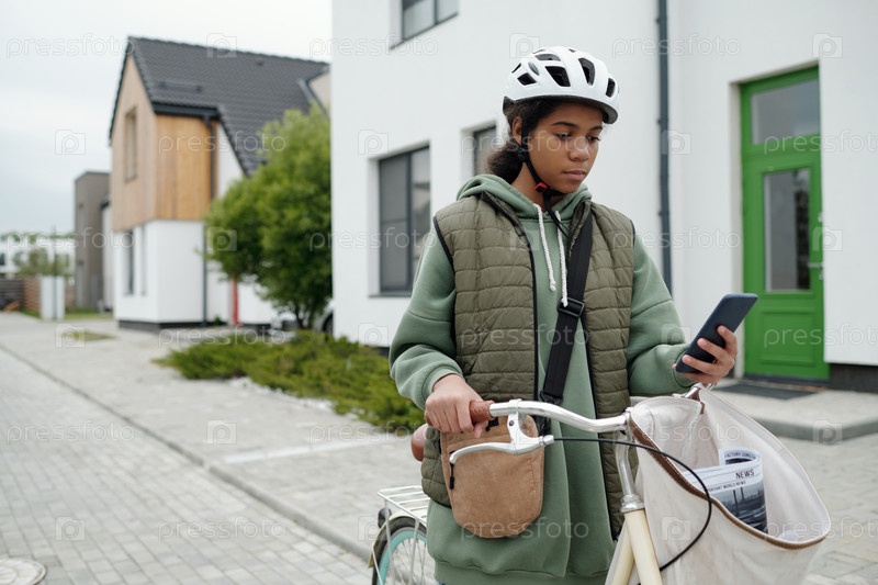 Почтовая женщина с велосипедом и смартфоном
