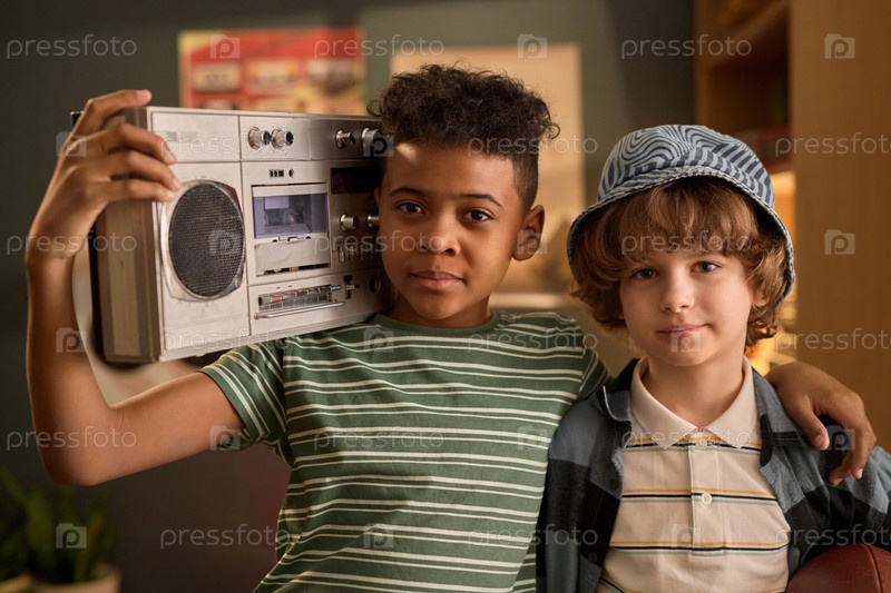 Портрет мальчиков, держащих бумбокс в гостиной