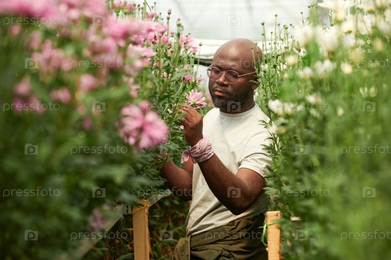 Черный садовник ухаживает за цветами в теплице