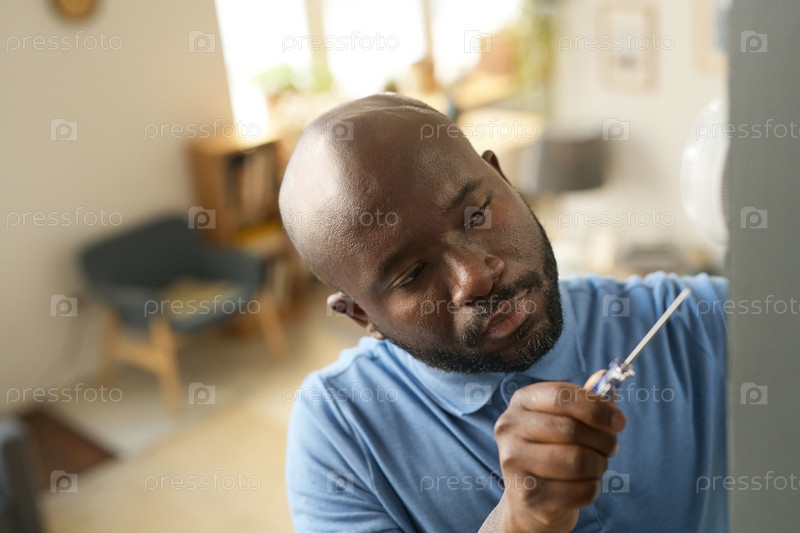 Черный мужчина устанавливает домашнюю камеру видеонаблюдения