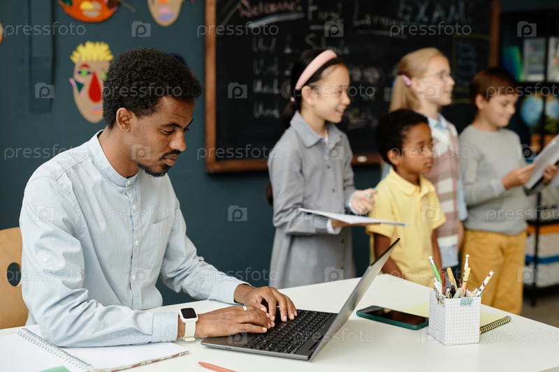 Афроамериканский учитель печатает на ноутбуке в классе начальной школы
