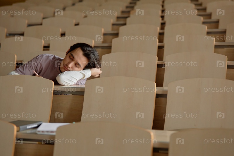 Мужчина-студент засыпает в пустом классе колледжа