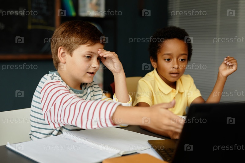 Молодой мальчик, указывающий на ноутбук во время учебы с другом-мужчиной в классе