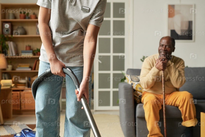 Удаление пыли из гостиной с сидящим пожилым человеком