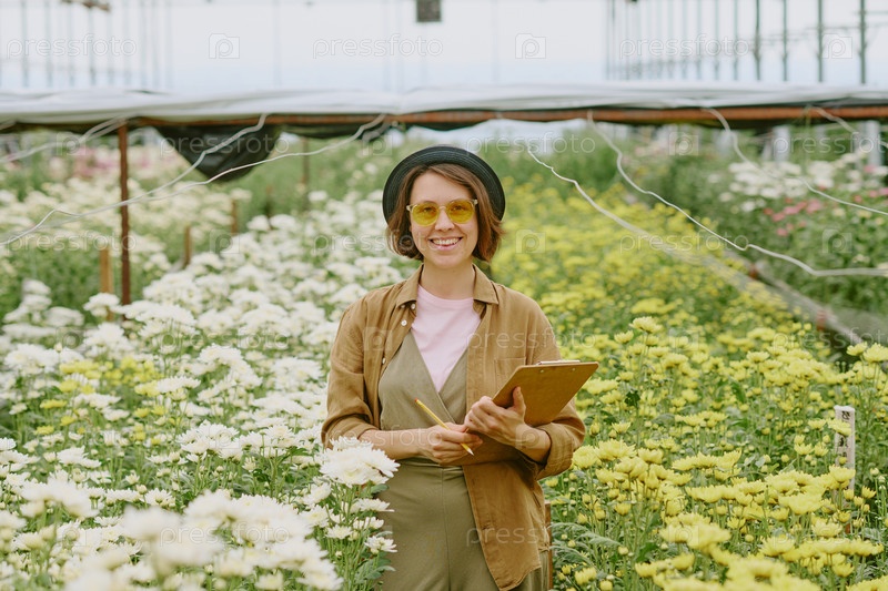 Улыбающаяся женщина держит блокнот на цветочном поле