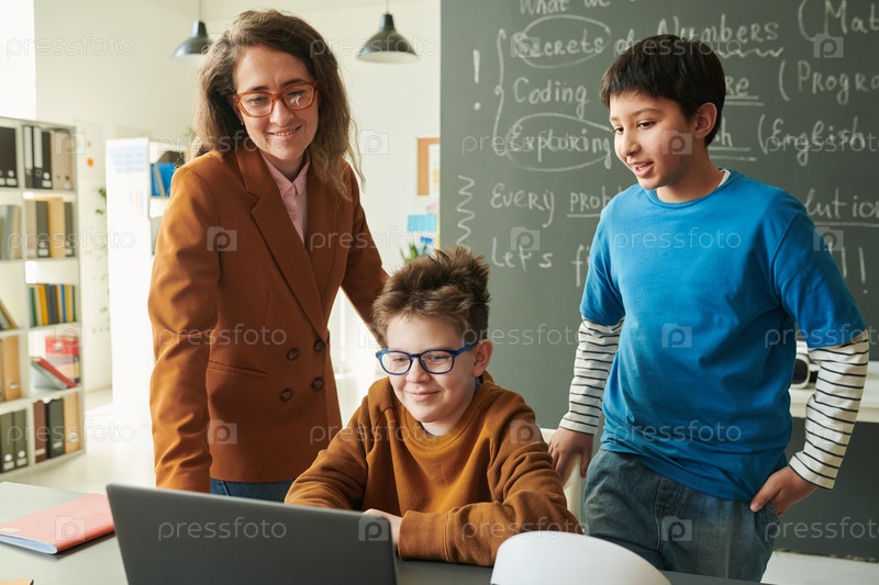 Улыбающаяся учительница Две девочки смотрят на ноутбук