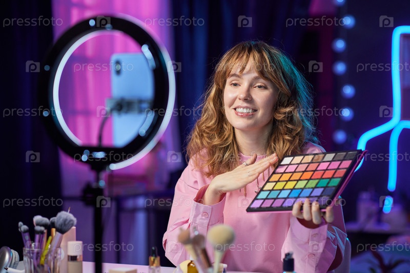 Улыбающаяся девушка рассматривает макияж
