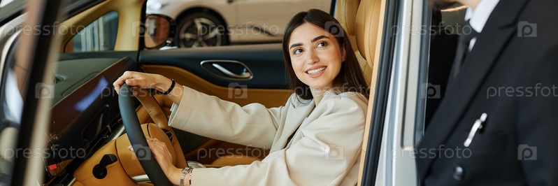 Счастливая женщина на водительском сиденье тестирует демонстрационный автомобиль в дилерском центре