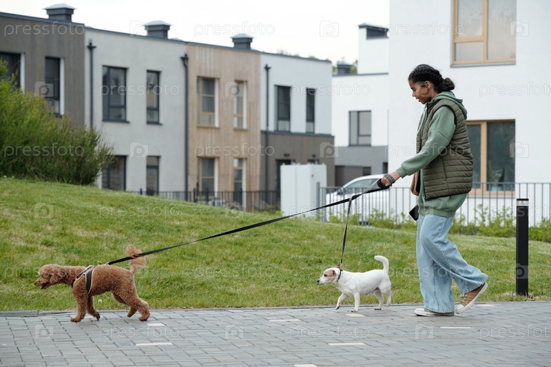 Хранитель собак гуляет с двумя домашними животными