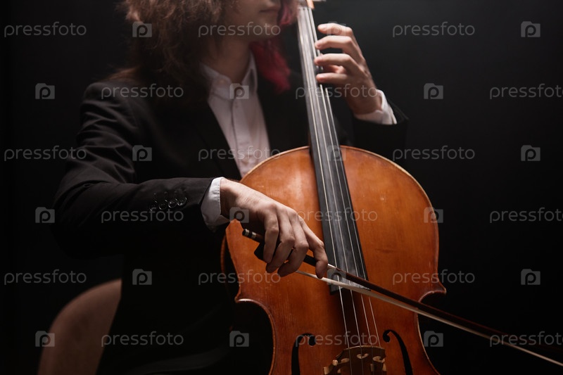 Виолончелист исполняет музыку с виолончелью в черном костюме