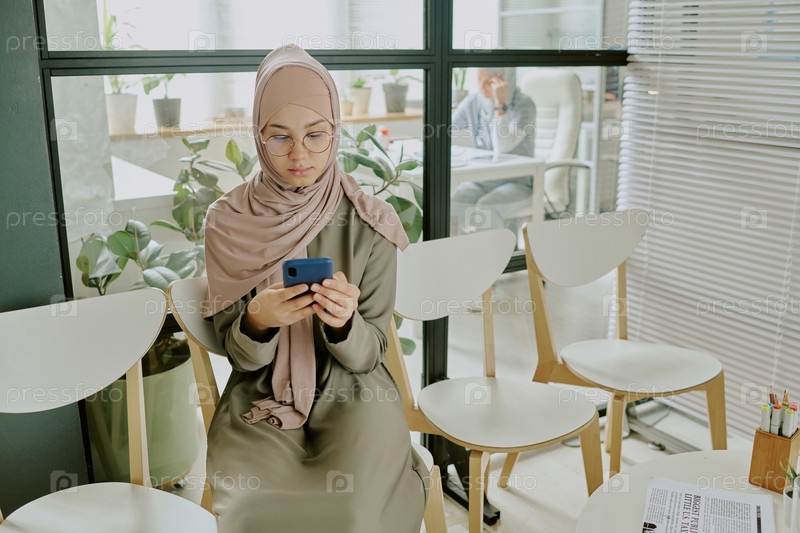 Мусульманка сидит в современном офисе, используя смартфон